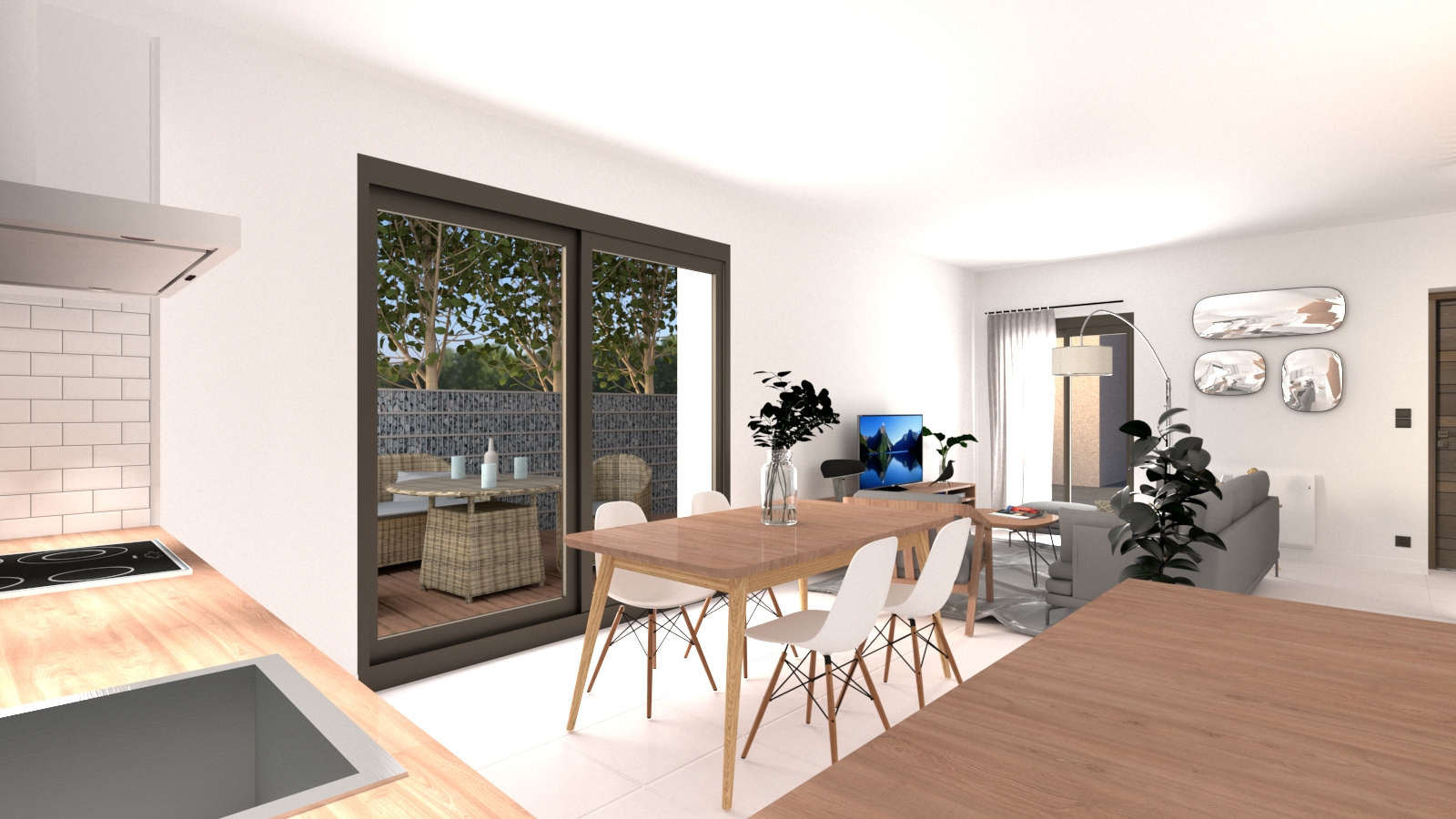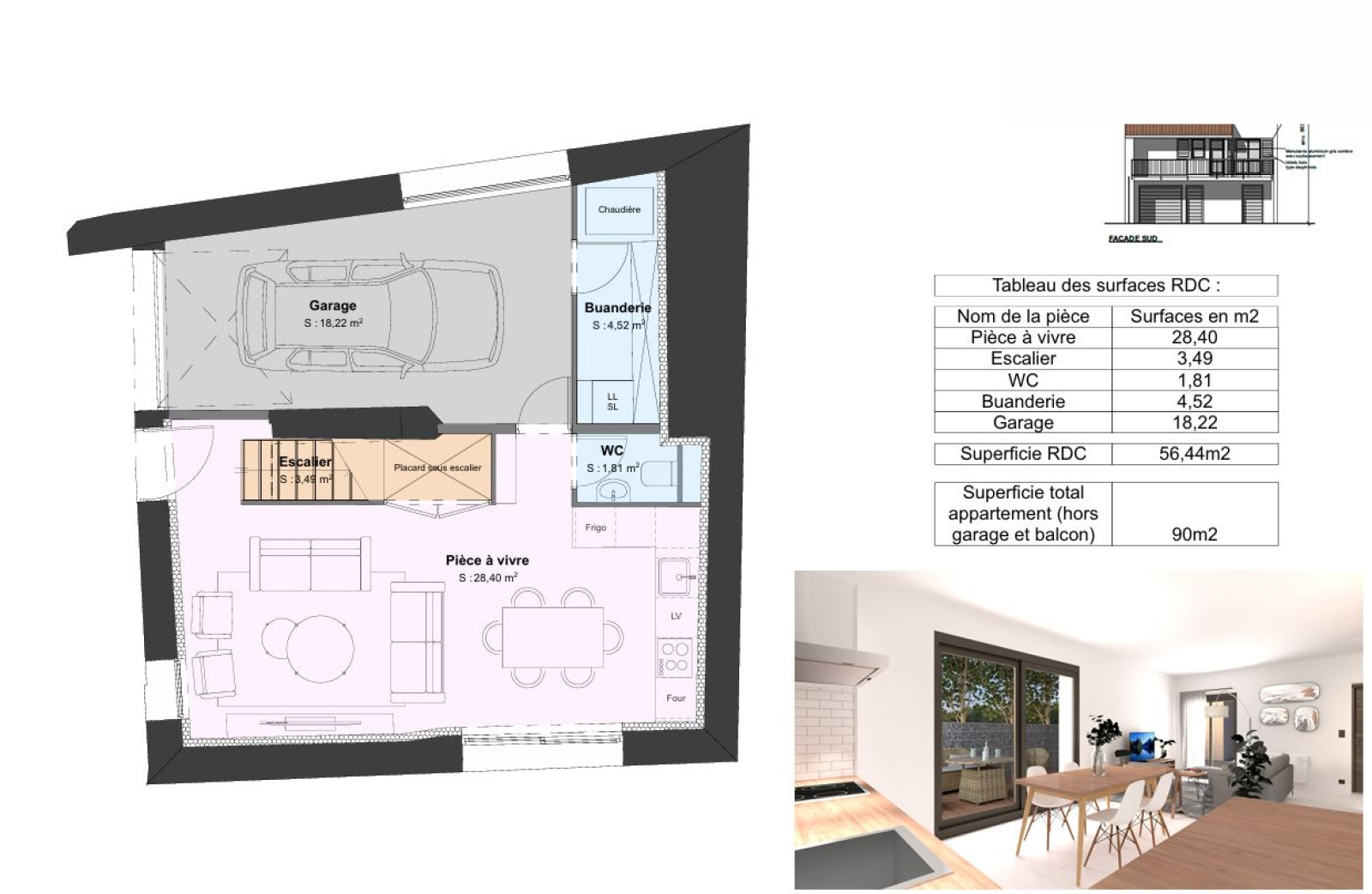 Au rez-de-chaussée : un séjour ouvert sur une cuisine, une buanderie et un WC.