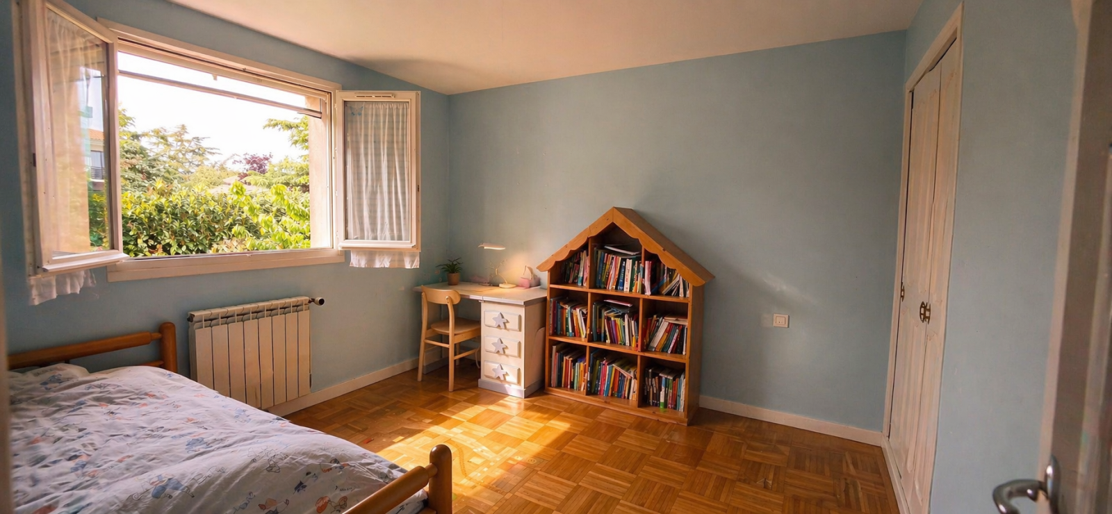 En demi-niveau, deux grandes chambres avec rangements, dont une avec accès à une terrasse exposée plein Ouest, ainsi qu’une salle de bains fonctionnelle.