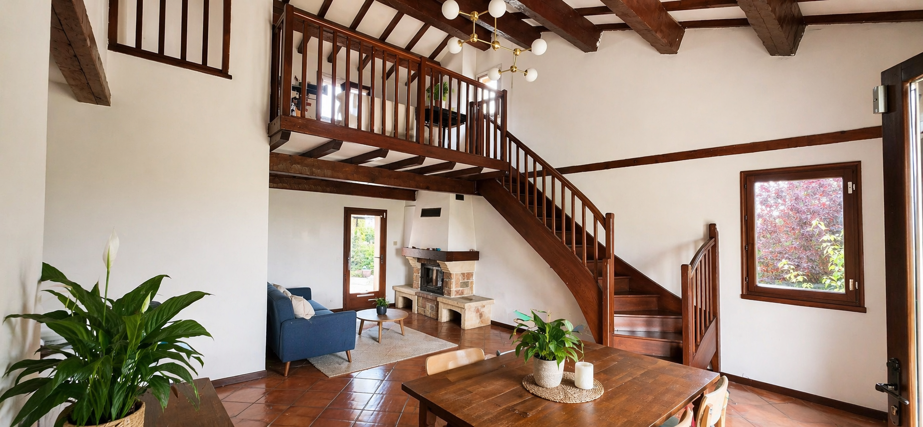 Dès l’entrée, vous serez séduit par les volumes. Le rez-de-jardin propose une belle pièce de vie avec plafond cathédrale, ouverte sur une mezzanine, créant une atmosphère chaleureuse et aérée.